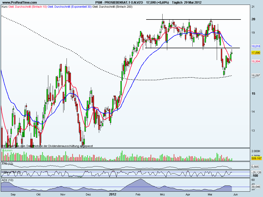 ProSieben hat einen schönen Rücksetzer auf das Ausbruchsniveau der Seitwärtsrange hingelegt, könnte eine neue Chance für Abwärtsdynamik werden.