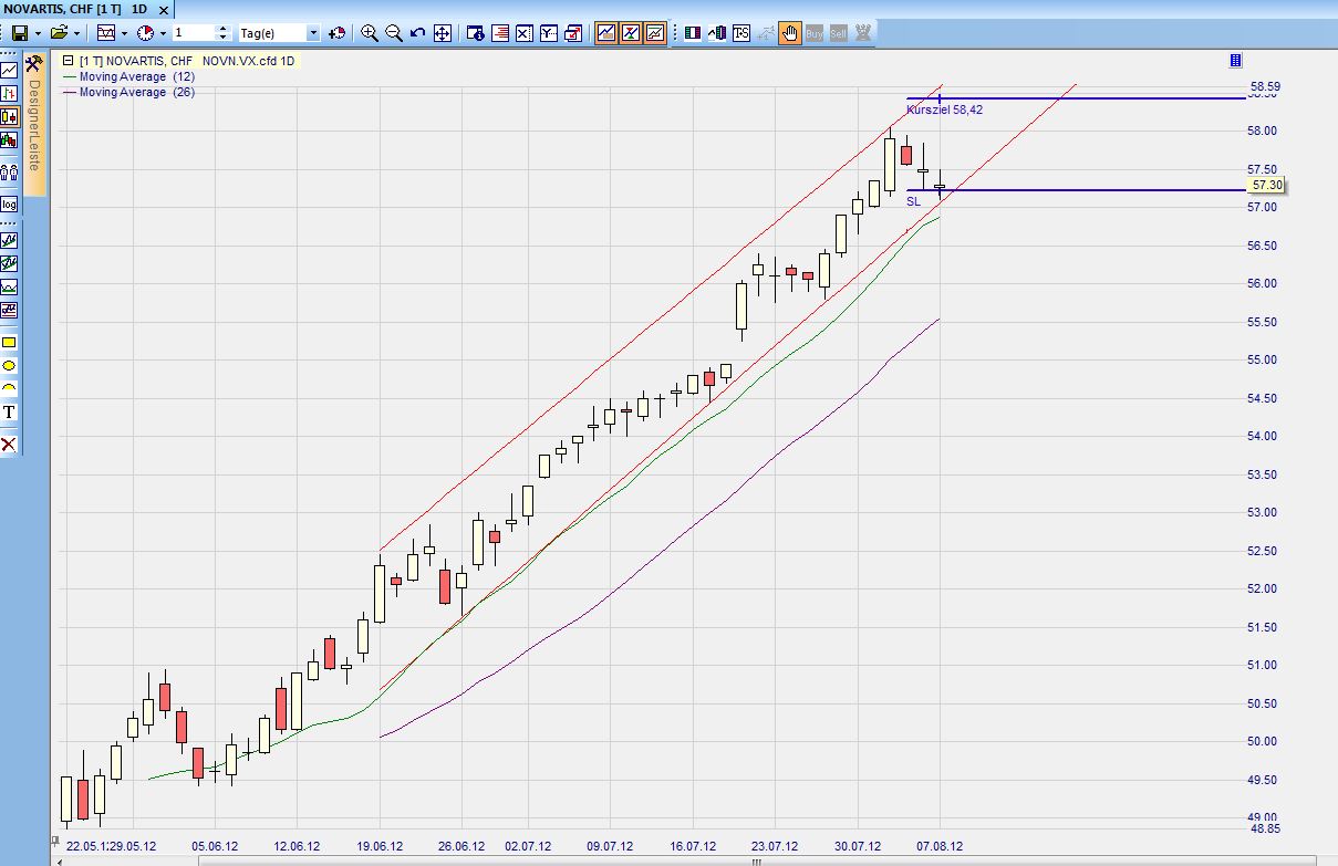 Für morgen habe ich Novartis gekauft. Trendkanal wie aus dem Bilderbuch, kleine Kerze am unteren Kanalrand, und Kursziel ist im Kanal zu schaffen. Siehe Screenshot.