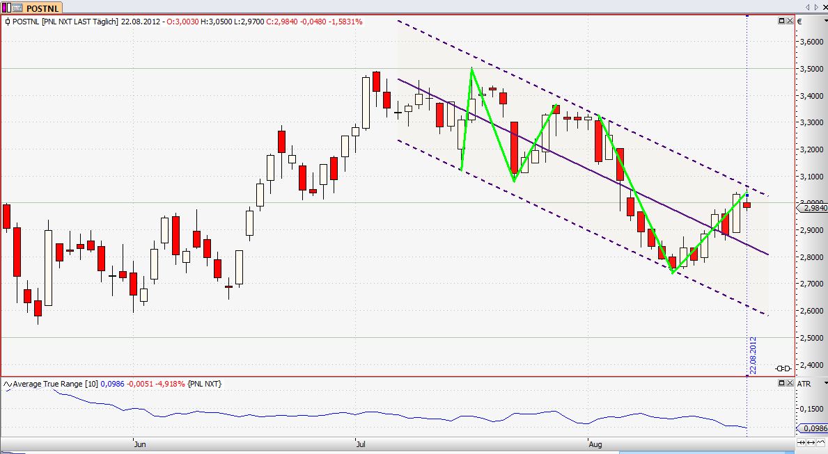 Bei PostNL liegt das Kursziel brav im letzten Swingtief und der SL oberhalb der 3,- €. Also wenn der Auslöser erreicht wird, sieht das doch gut aus. Dafür sehe ich darüber hinweg, dass die Kerze bzw. der Docht schon etwas länger ist.