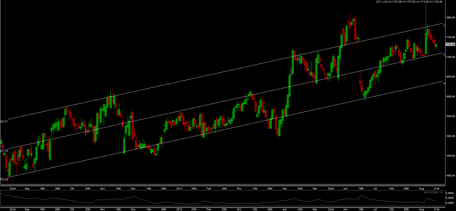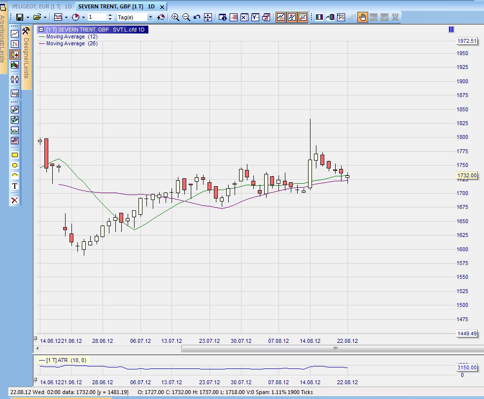Severn Trent ist z.B. an der Heimatbörse London Stock Exchange heute definitv rot, zwar nur leicht, aber auf keinen Fall dick grün wie im Chartfenster von Elbroto (Eröffnung 1730 GBp, Schlußkurs 1729 GBp).