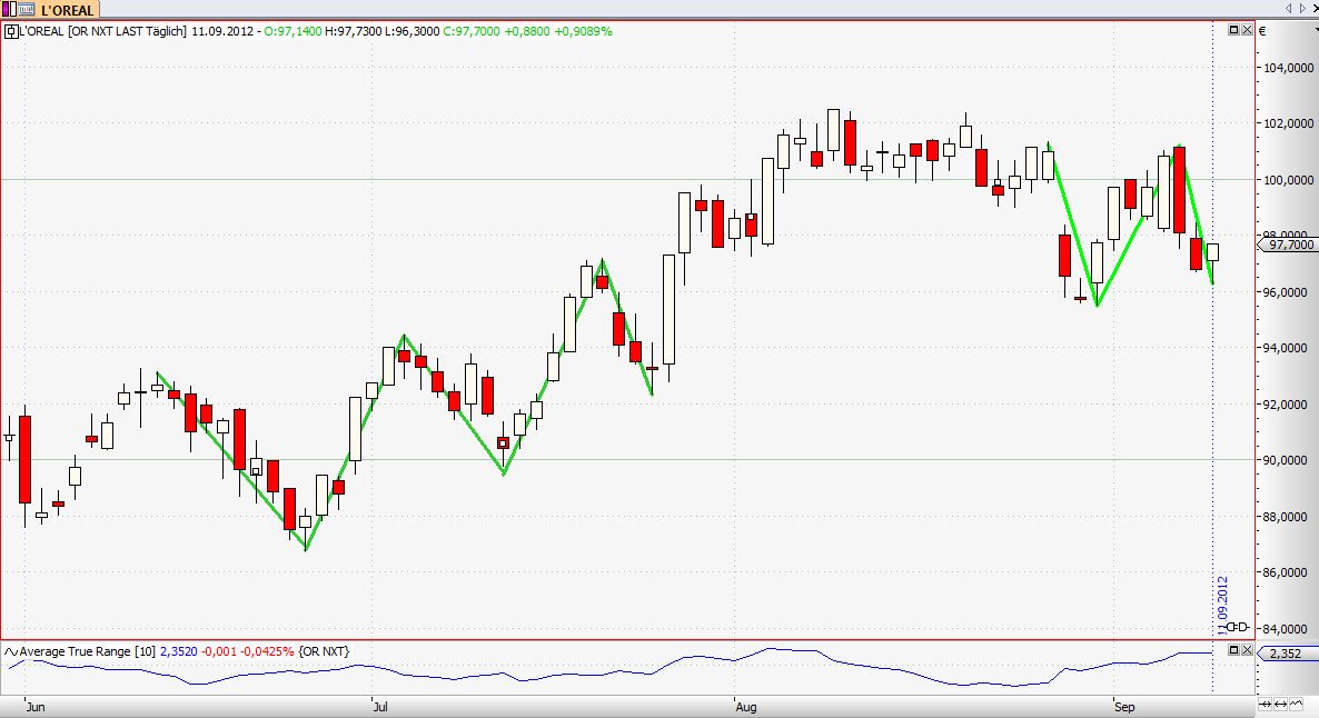 L'Oreal ist sicher ein schöner Swing, aber nach den letzten Wochen sage ich mir bei jedem Chart "Ein Aufwärtstrend besteht aus höheren Hochs und höheren Tiefs", und die sehe ich da nicht.