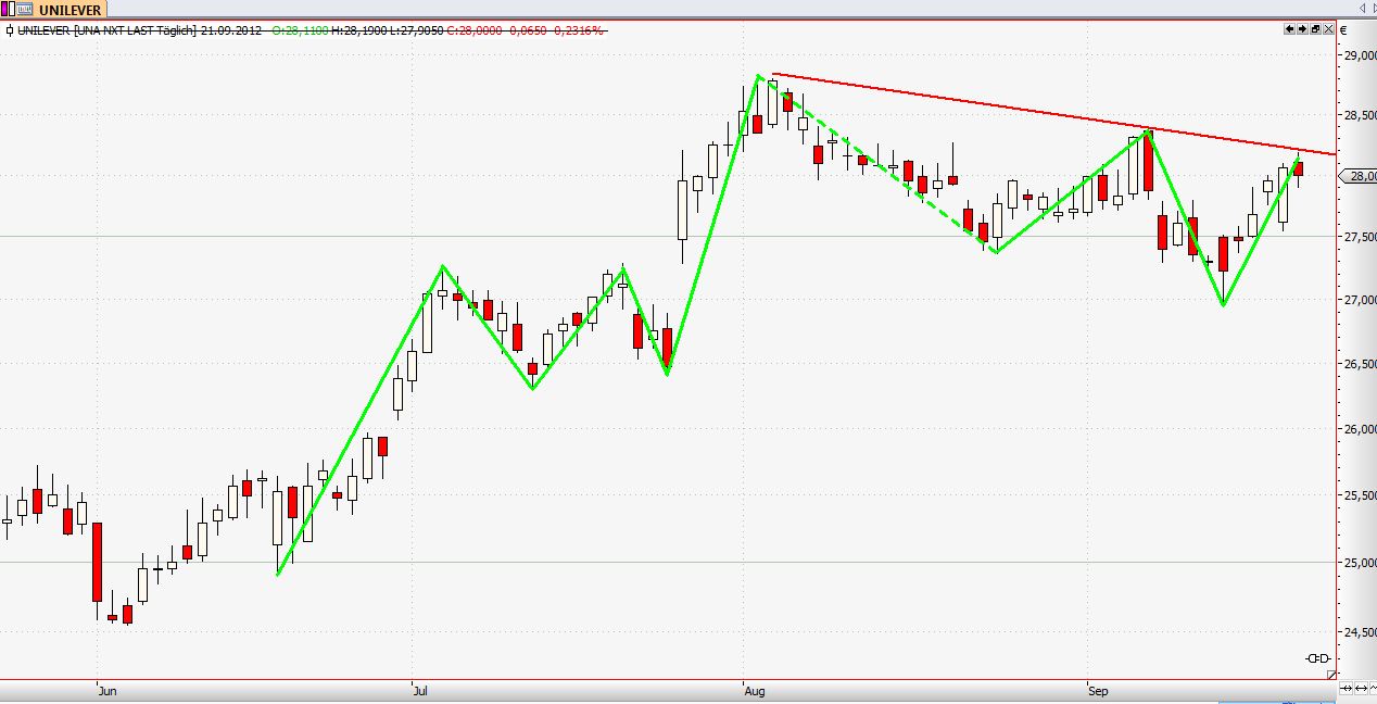 Axa war mein Platz 2, gestört hat mich, dass das Kursziel mitten in der Widerstandszone liegt. Außerdem ist formal der Trend mit dem tieferen Tief jetzt im Vergleich zum 13.09. gebrochen, deswegen den Trend im Trade-Check auf gelb gesetzt.