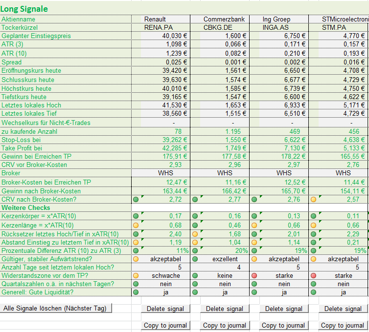 Commerzbank ist mir schon wieder zu weit vom Extrempunkt von Donnerstag entfernt, Renault hat höheres Hoch als gestern.Der Autor ist in den besprochenen Werten zumeist selbst investiert. Traden auf eigene Gefahr, Signale sind aktuell großteils experimentell zwecks Challenge "In 30 Tagen zur Trading Strategie".