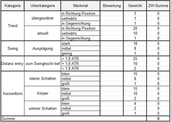 Die Teilnoten sind rein diskretionär aus dem Bauch heraus, selbstverständlich wird man hier nie das Gleiche sehen. Bei der Trendigkeit kann ich beim 2. Blick auf den Chart aber tatsächlich eine 3 geben. Was die Kerzengröße angeht: 1 ATR mag schon stimmen, aber sieh sie dir im Vergleich zu den Vorkerzen an. Und wie nahe man am Extrempunkt einsteigen kann.