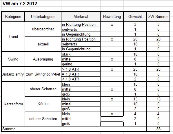 Ich hatte mir über den Symphatie-Faktor bei der Auswahl vom mehreren möglichen Positionen Gedanken gemacht und bin zu einer nutzwertanalytischen Betrachtungsweise gelangt. Hierfür ordne ich verschiedenen Kategorien unterschiedliche Merkmalsausprägungen zu und bewerte diese. Lässt sich einfach in Excel realisieren und hilft mir, den subjektiven Charakter der Auswahl zumindest für mich selbst transparent und etwas duplizierbar zu gestalten. Ich benutze diese Auswahl allerdings nur für den Vergleich möglicher Positionen. Die ideale Position bekommt von mir 100 Punkte. Angehängt habe ich ein leeres Tableau und als Beispiel VW vom 7.2.2012 mit ausgefülltem Tableau bzw. durchgeführter Bewertung (übrigens für mich ein recht gutes long-Signal). Die Kategorien, Merkmale und Bewertungen sind natürlich subjektiv und individuell.