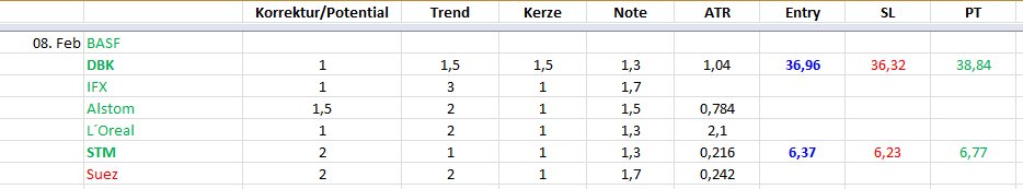 [table='Aktie,Korrektur/Potential,Trendigkeit,Kerzenform,Note, Entry, SL, PT'] [*]ST Microelectronics[*]1-[*]1[*]1[*]1-[*]6,43[*]6,28[*]6,86[*]Safran[*]2[*]2[*]1[*]2,7[*]33,58[*]33,94[*]32,56[*]