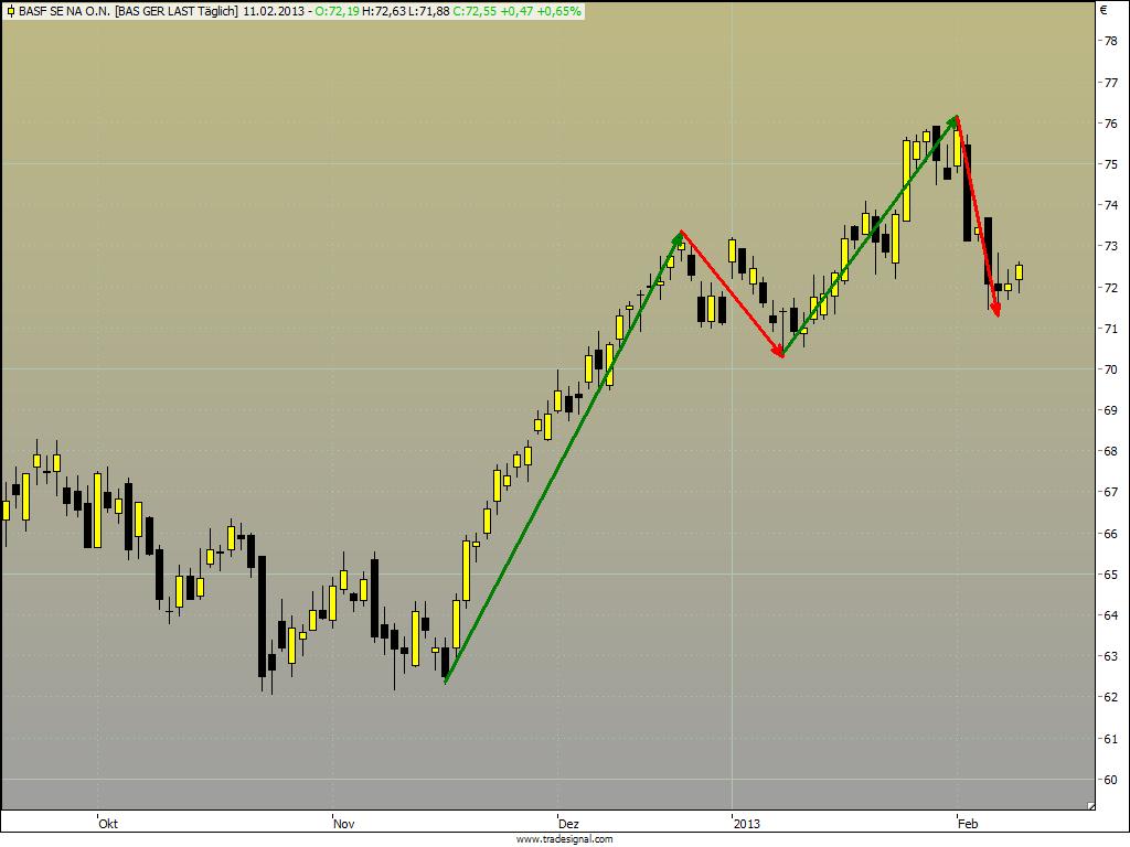 ein Abwärtstrend bei BASF, wirklich? Nur weil das letzte kurzfristige Swingtief vom 24.01. unterschritten wurde? Ich zeichne die Swings mal etwas gröber und sehe hier noch kein Problem.