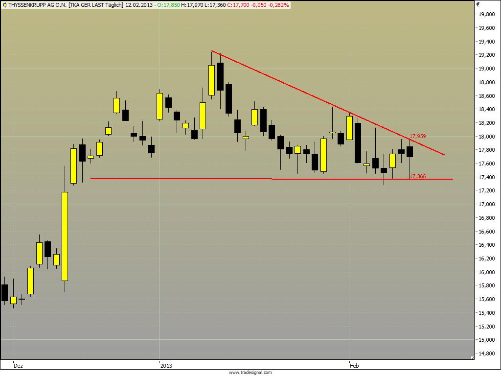 Chart zu Thyssen, zwecks EinkeilungDer Autor ist in den besprochenen Werten zumeist selbst investiert. Traden auf eigene Gefahr, Signale sind aktuell großteils experimentell zwecks Challenge "In 30 Tagen zur Trading Strategie".