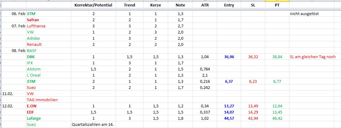 EDF nicht ausgelöst und wird storniert. Lafarge rast gleich großartig in Richtung Norden, wieder zeigt sich, dass Gaps (mit Slippage) nichts Schlechtes sein müssen. Bei EON hat sich noch nicht viel getan, und Safran landete mit kaum nennenswertem Gewinn im Zeitstopp.
