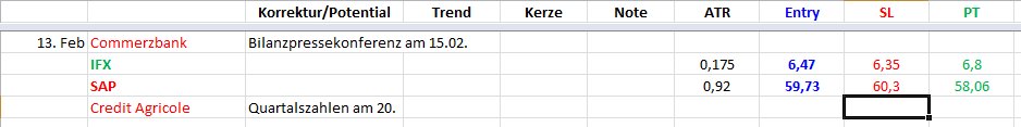 SAP und Infineon. Commerzbank und Credit Agricole wären weitere Shortkandidaten, haben aber in der Zeit bis zum Zeitstopp Quartalszahlen bzw. Bilanzpressekonferenz.Der Autor ist in den besprochenen Werten zumeist selbst investiert. Traden auf eigene Gefahr, Signale sind aktuell großteils experimentell zwecks Challenge "In 30 Tagen zur Trading Strategie".