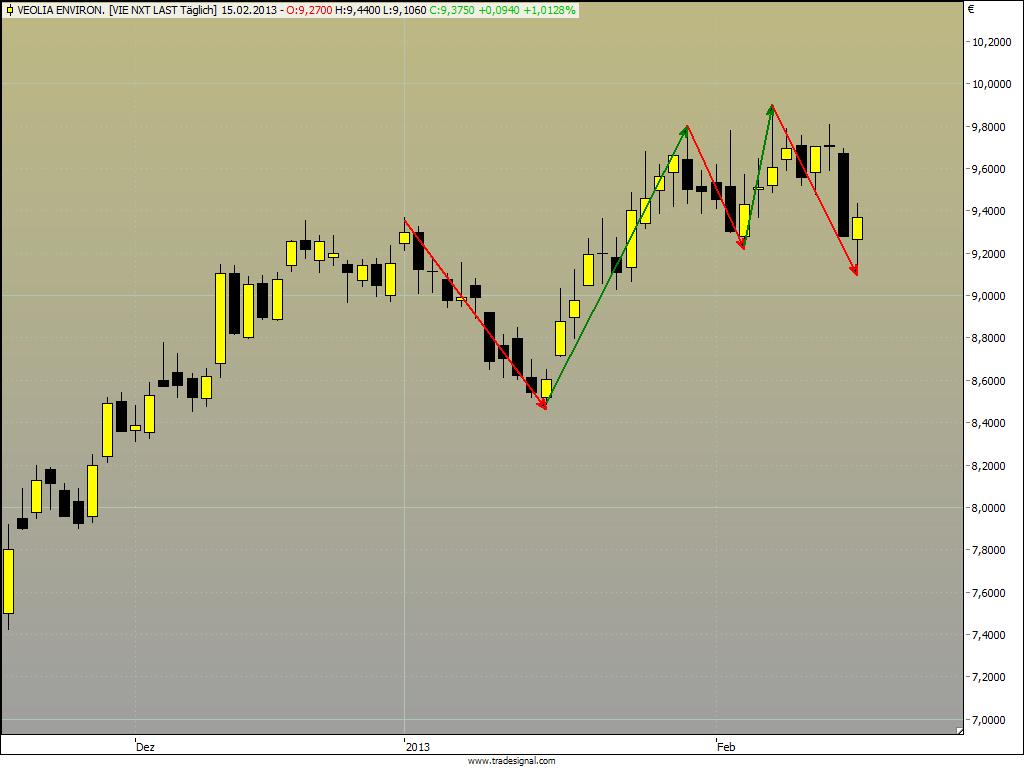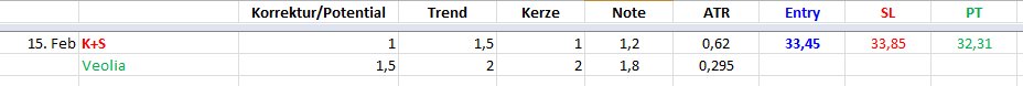 Ich hab lange überlegt, Veolia zu kaufen am Montag. Letztendlich ist mir der Trigger am Tageshoch aber doch schon zu weit vom Extrempunkt enternt für einen günstigen Einstieg. Bei K+S dagegen zögere ich keine Sekunde.Der Autor ist in den besprochenen Werten zumeist selbst investiert. Traden auf eigene Gefahr, Signale sind aktuell großteils experimentell zwecks Challenge "In 30 Tagen zur Trading Strategie".