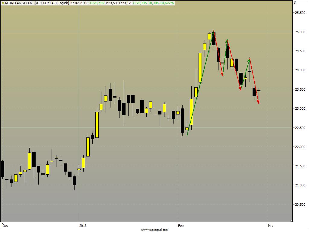 Formal ist Metro gerade noch ok. Eine bullische Kerze ist es nicht wirklich geworden heute, und vom Tief ist das Tageshoch schon wieder ein Stück entfernt. Dazu zieht sich die Korrektur schon ziemlich lange hin, beide Swingtiefs wurden klar unterboten. Siehe Chart, nichts für mich.Der Autor ist in den besprochenen Werten zumeist selbst investiert. Traden auf eigene Gefahr, Signale sind aktuell großteils experimentell zwecks Challenge "In 30 Tagen zur Trading Strategie".