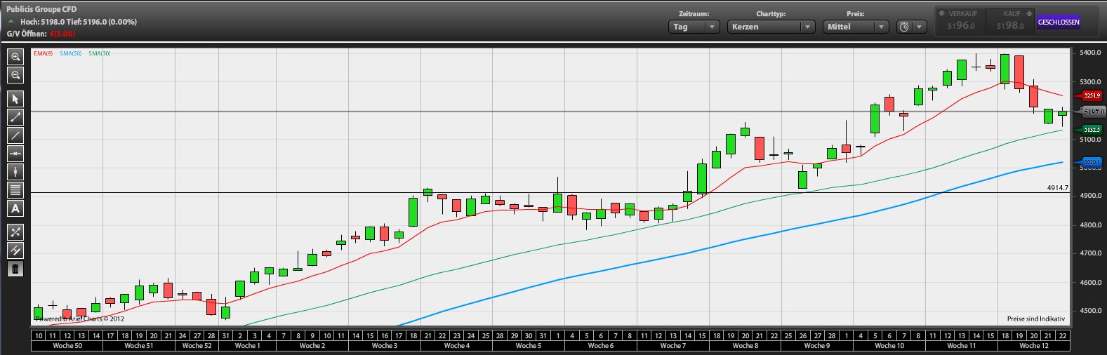 Ich kann mir die Kerzenfarbe bei Publicis aussuchen! Im Demokonto ist die Kerze bullish, im realen Konto bearish. Wie kann das eigentlich sein? Werde ich wohl mal bei WHS nachfragen müssen... Wie kann man bei WHS eigentlich Charts rauskopieren?