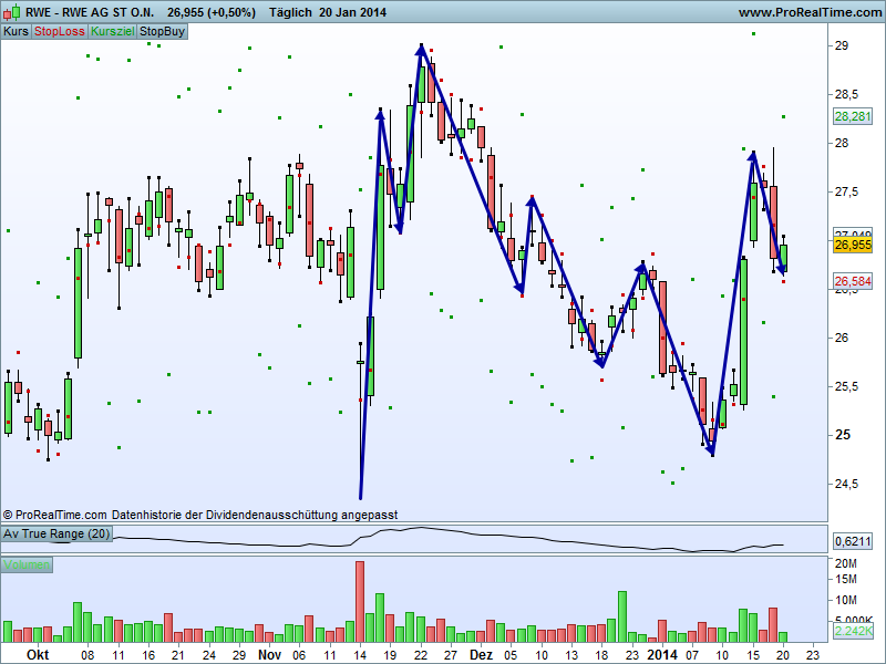 ich komme heute auch bei RWE raus. Die Alternativen BNP Paribas (schon wieder gelaufen), KPN (keine Swings), STMicroelectronics (Gaps machen die Aktie unberechenbar) gefallen mir nicht ganz so gut.