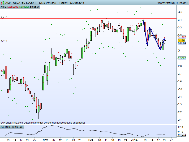 ALCATEL Lucent ein sehr kurzer DownTrend, und vllt ist der Ausbruch (blauer Kreis) aus der Range nur ein Fehlsignal und der Kurs läuft nach oben, oder es ist ein Pullback und der Kurs läuft nach unten -> deshalb zweitklassig