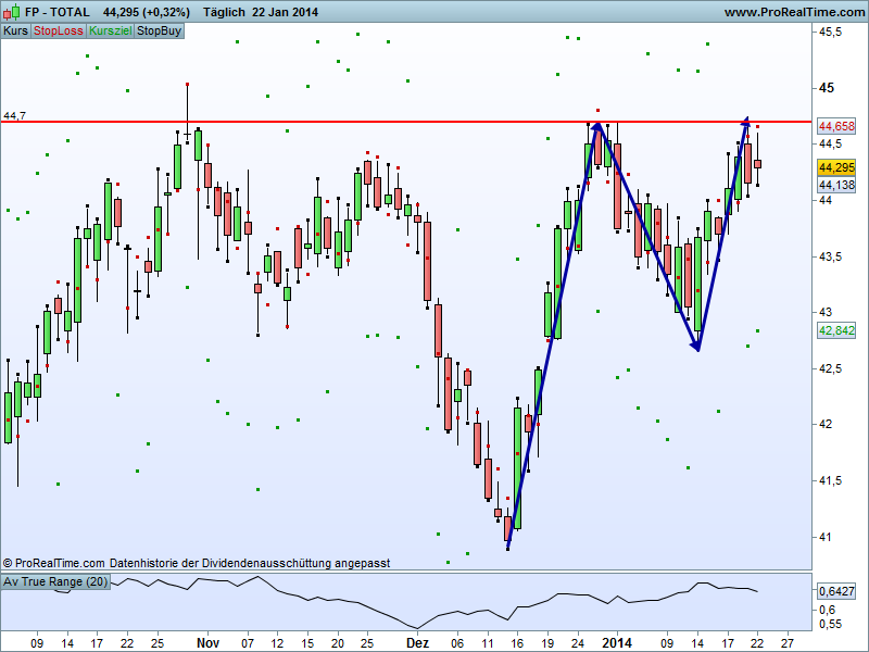 Total hat an einer Widerstandslinie ein Doppeltop gebildet und eine kleine bearische Kerze, könnte man shorten