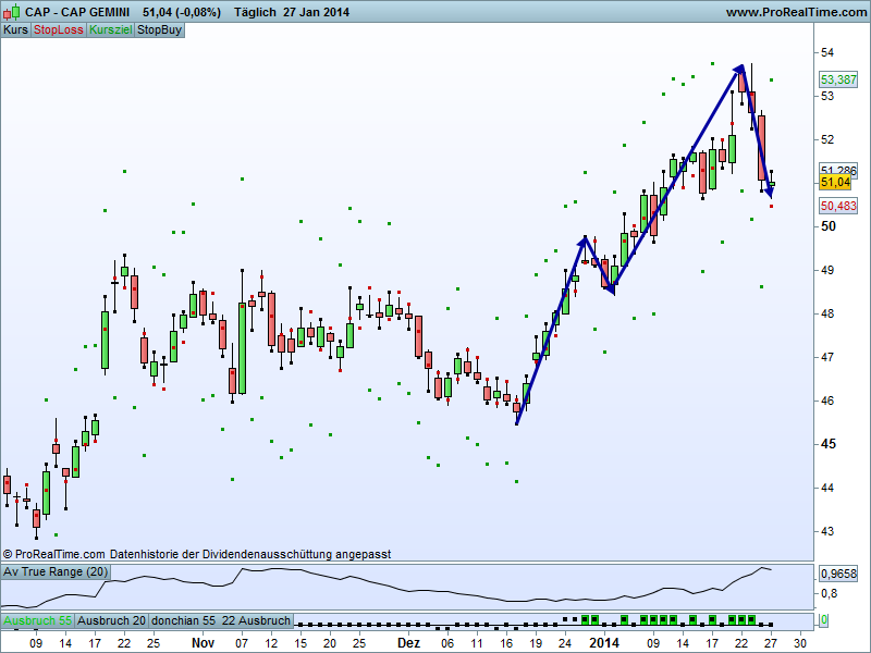 Von Alcatel lasse ich die Finger, da mir ein Doji mit nur einer Kerze im Gegentrend und zusätzlich einem