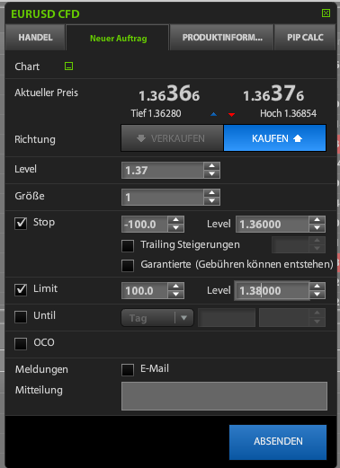 Dort unter "Neuer Auftrag" definierst du mit "Level" deinen gewünschten Einstiegskurs. Ist dieser wie im Beispiel EUR/USD gezeigt höher als der aktuelle Kurs, und wählst du "Kaufen", dann wird daraus eine Stop-Buy-Order.
