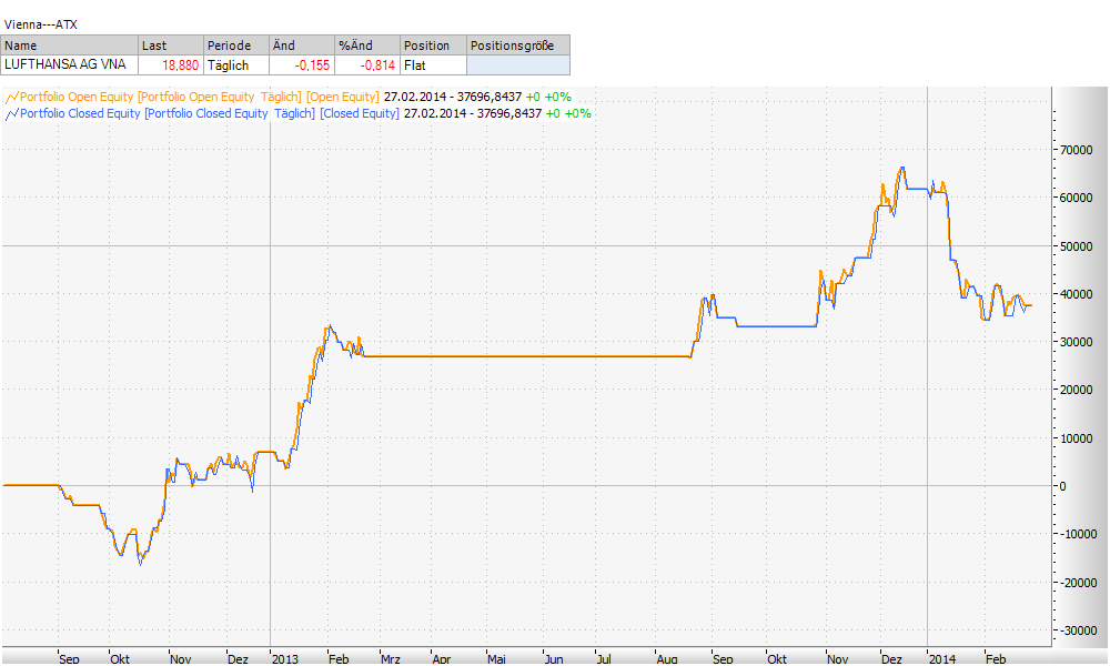 - Stop auf 0,6 ATR wie gehabt, aber als Trailing Stop nachgezogen, sobald der Wert im Plus ist. Der Stop wäre also immer 0,6 ATR entfernt. Das Nachziehen sollte immer nach Börsenschluss erfolgen.