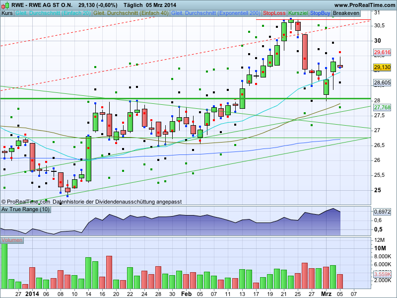 RWE guter Kandidat für morgen, Dt. Börse, Dt. Post, Dt. Telekom, MUV ebenso. Meine Charts zicken grad rum, muss ich morgen vor 9 nochmal ran.Der Autor ist in den besprochenen Werten zumeist selbst investiert. Traden auf eigene Gefahr, Signale sind aktuell großteils experimentell zwecks Challenge "In 30 Tagen zur Trading Strategie".