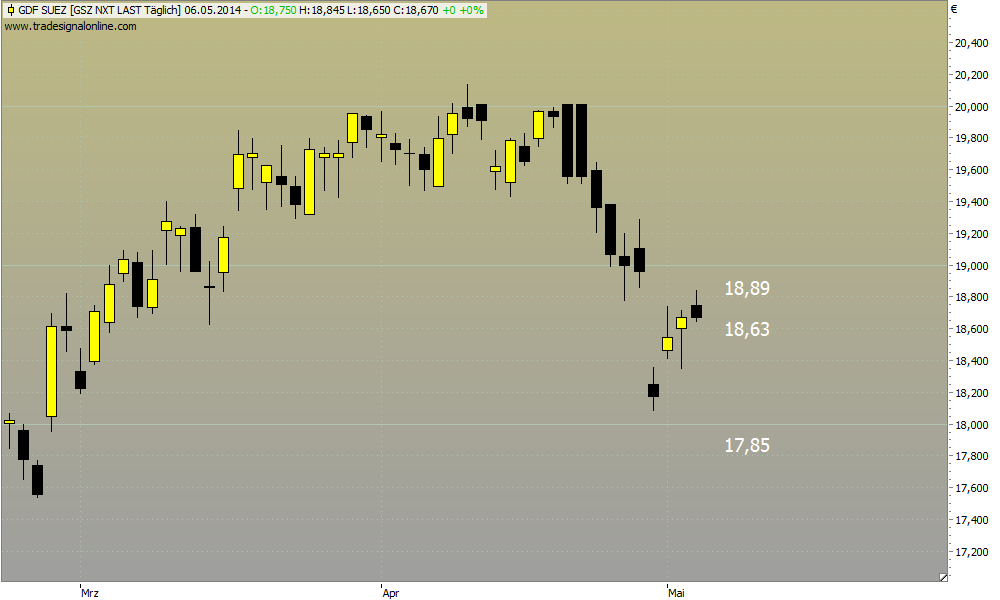 GDF Suez schöner Shortkandidat für heute.Der Autor ist in den besprochenen Werten zumeist selbst investiert. Traden auf eigene Gefahr, Signale sind aktuell großteils experimentell zwecks Challenge "In 30 Tagen zur Trading Strategie".