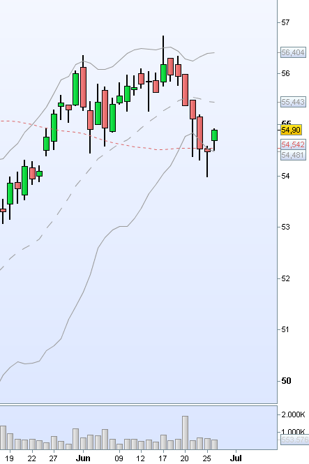 Selbst wenn heute eine kleine bullische Kerze entsteht, ist Adidas immer noch klar bearish. Zwar habe ich Adidas schon länger im Auge, aber nach unseren Regeln hier warten wir, bis eine neue Aufwärtsphase am Start ist, die dann wiederum kurz durch eine Konsolidierung mit anschließender kleiner grüner Kerze ein Signal erzeugen wird.