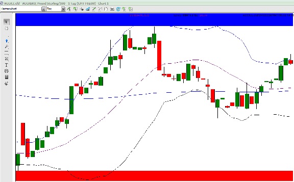 Aggreko (UK) -> sieht schon ein wenig bullish aus, höheres Hoch als das Letzte. Aber: RSI Indikator gibt ein schönes Verkaufssignal und auch die Bollinger Bänder hat der Chart nach oben verlassen.