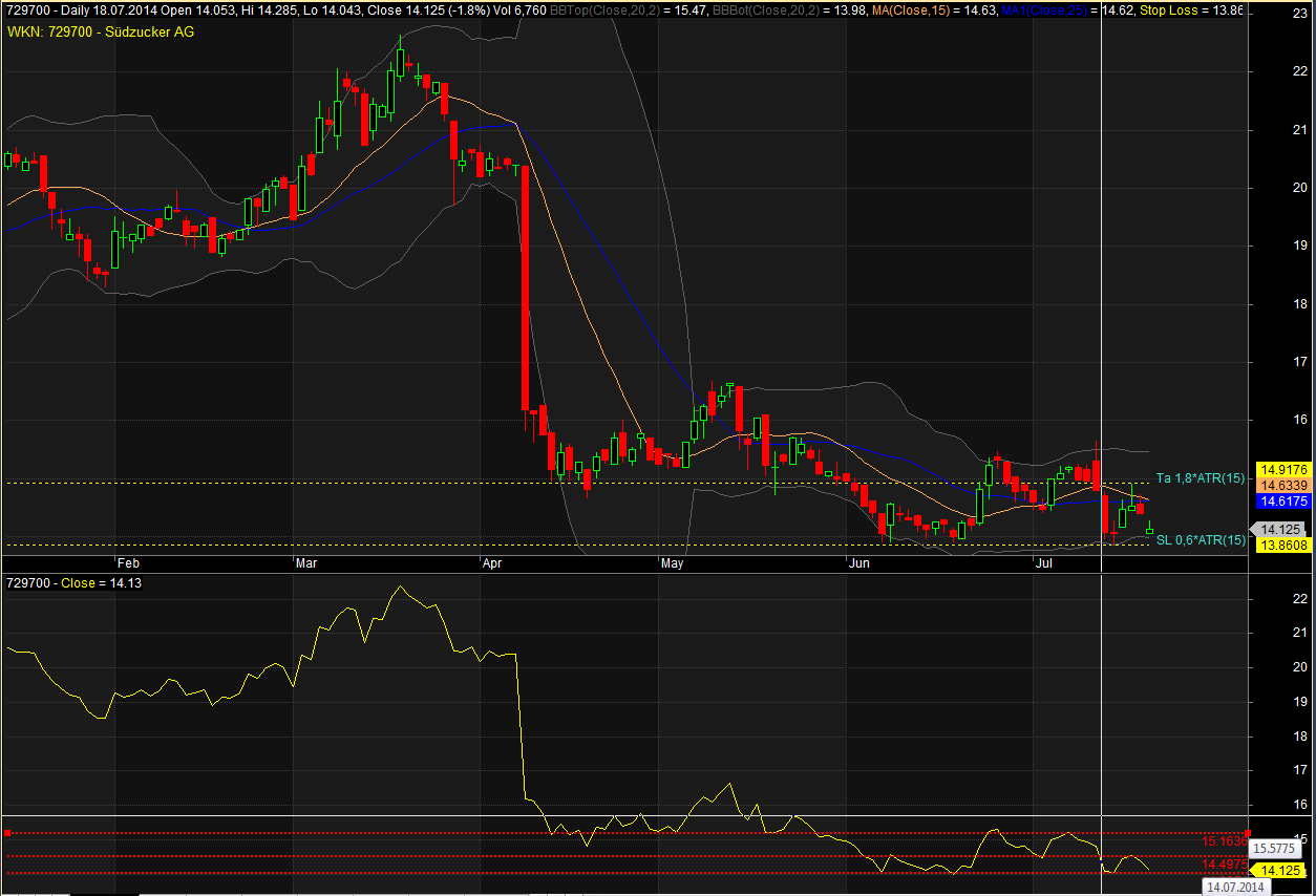 Allgemein ist Südzucker sicher nicht uninteressant, aber für unsere Taktik eher nichts, da zu gefährlich: Für mich ist hier ein klarer Boden noch nicht ersichtlich. Wenn am Donnerstag die rote Kerze kleiner gewesen wäre, hätte man hier sogar eher noch Short einsteigen können. Außerdem stört mich das höhere Tief von Anfang Juli, das jetzt ja nochmals unterboten wurde. Obwohl der Inverted Hammer nett ausschaut.