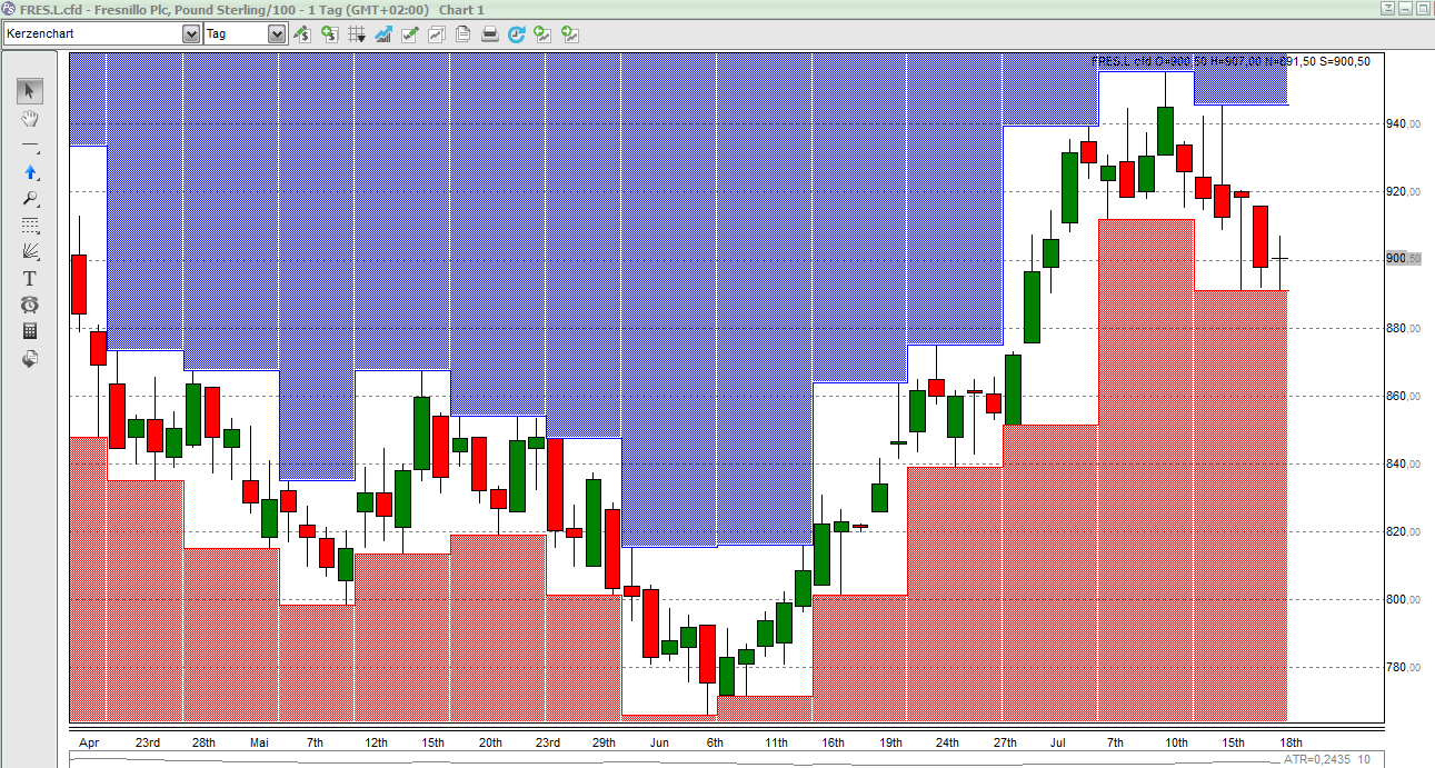 Mein Favorit für Montag ist Fresnillo (UK). In der Prostation ist die Kerze ein Doji, bei Guidants allerdings eine schöne kleine bullische.