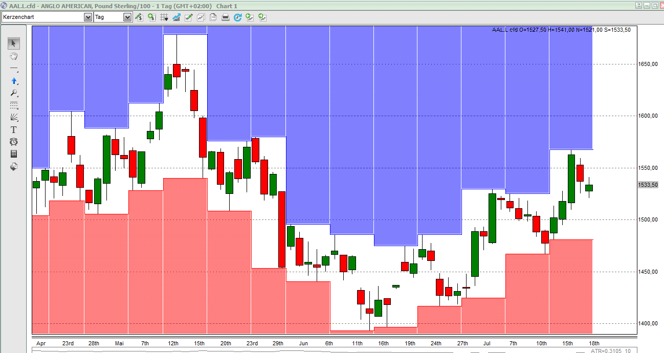 Long-Alternative ist Anglo American (UK), hier ist allerdings die Korrektur noch nicht ganz so stark und der Kurs ist recht mittig im aktuellen Kanal.