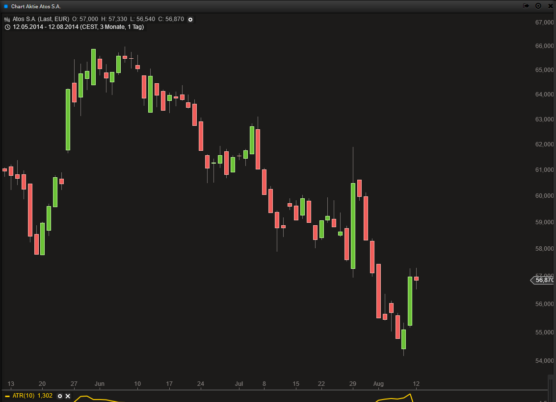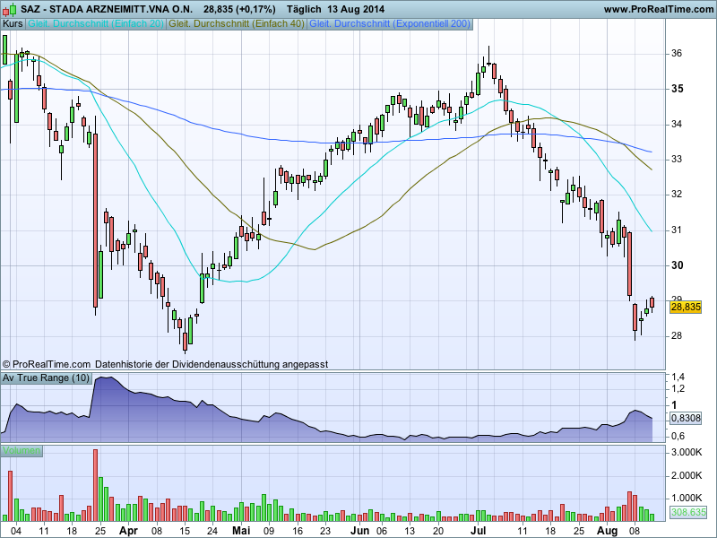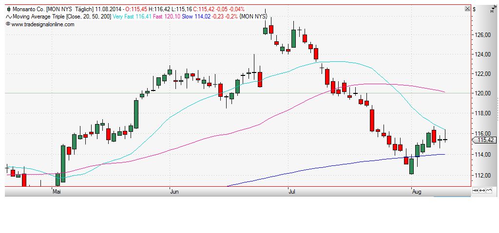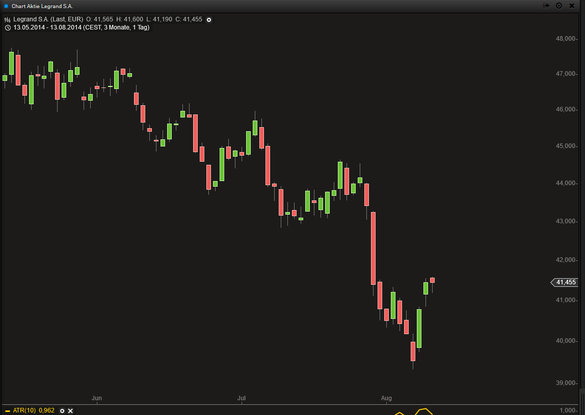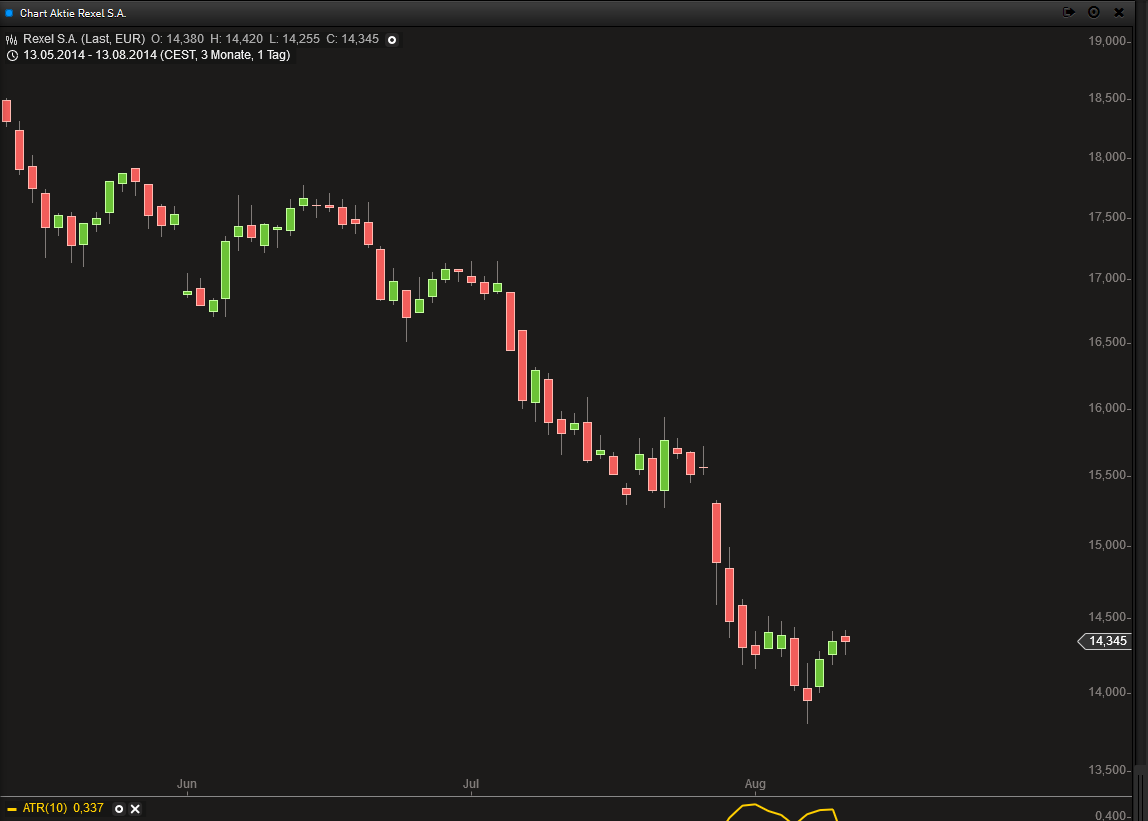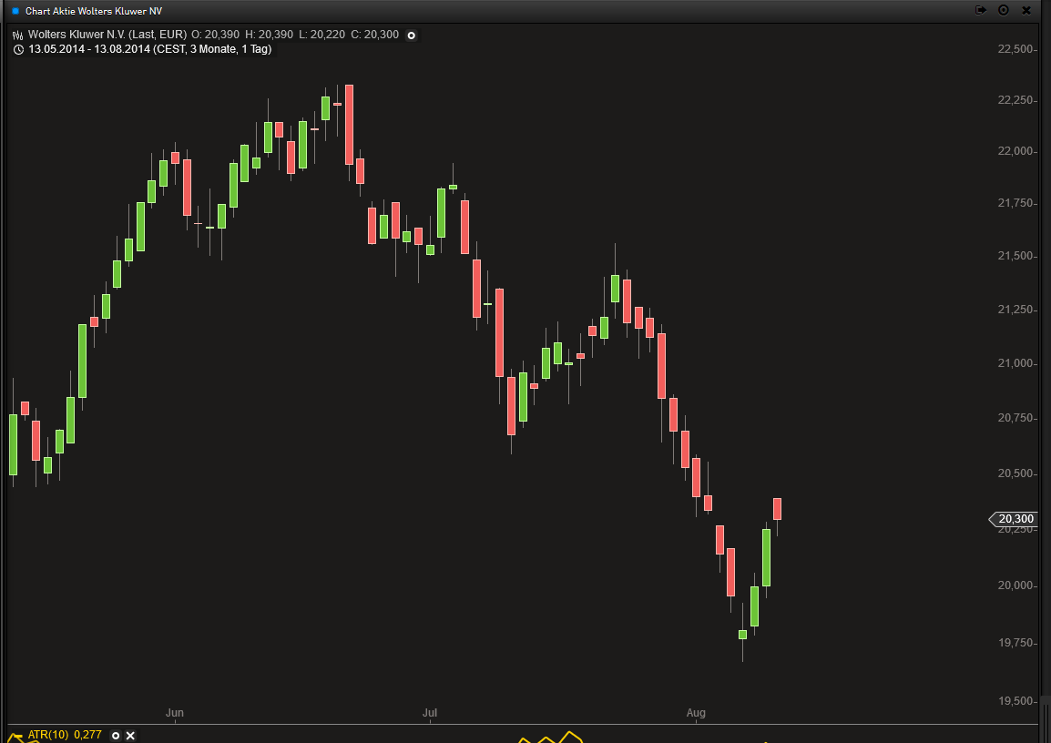 Nach einem mittelfristigen Abwärtstrend seit Mitte Februar 2014 wurde heute ein Aufwärtsgap gegen den Trend erzeugt. Zusätzlich ein kleiner Kerzenkörper mit bearishem Topping Tail.
