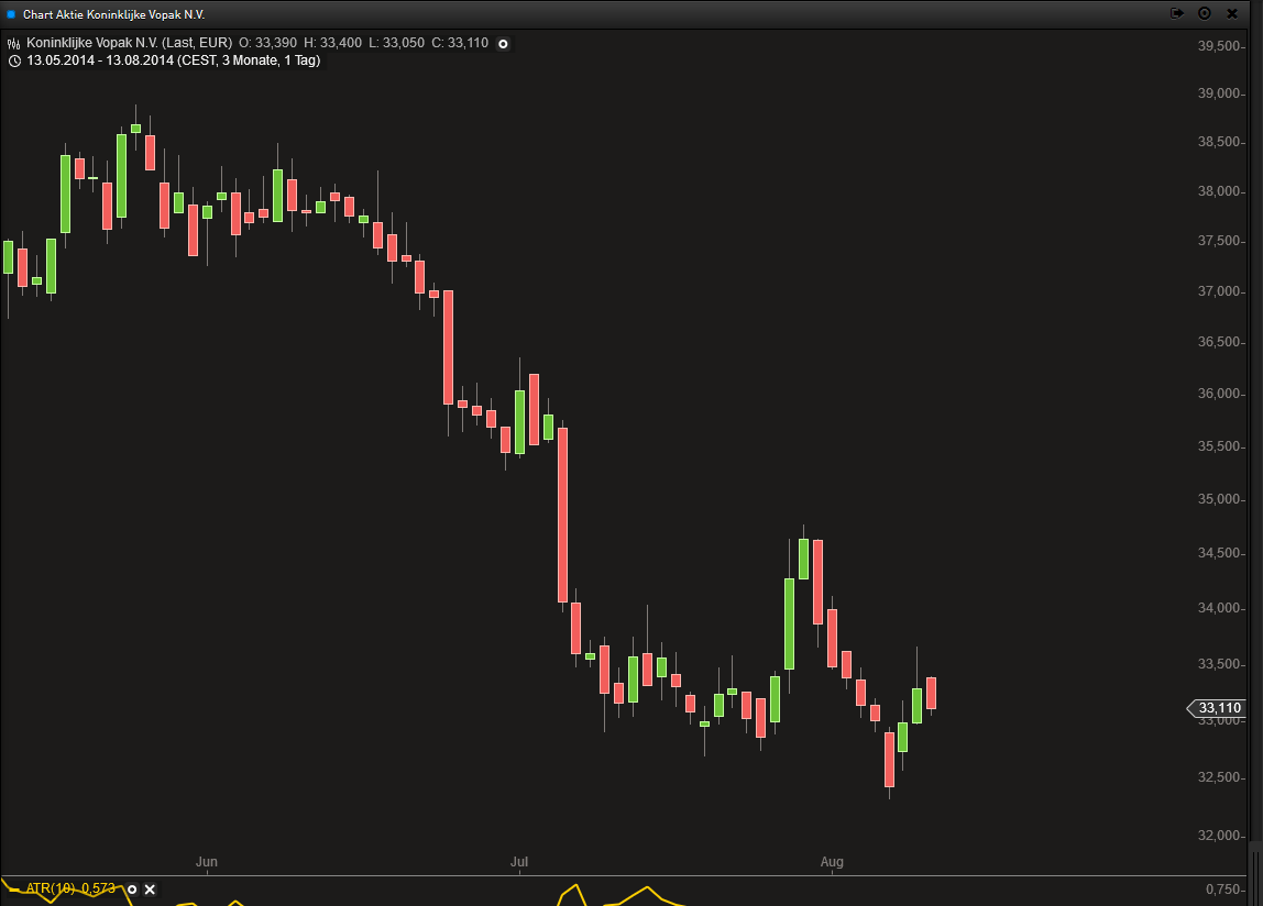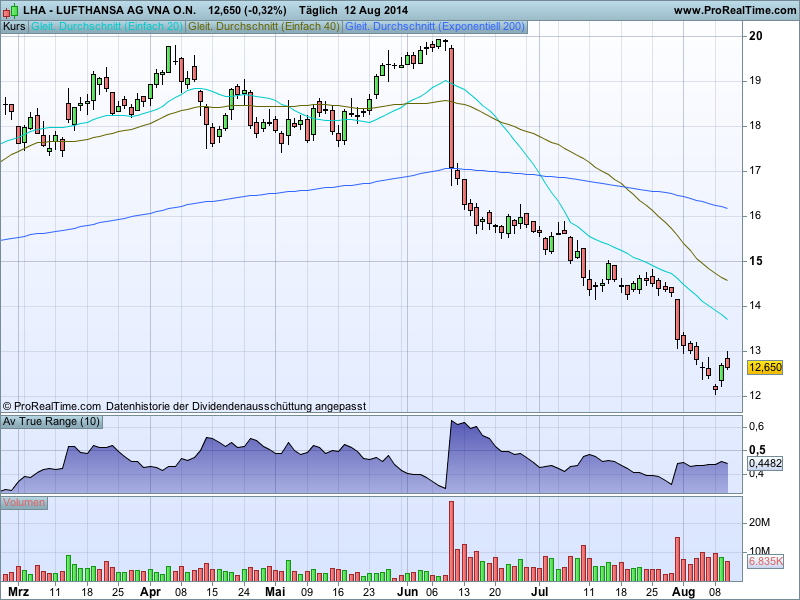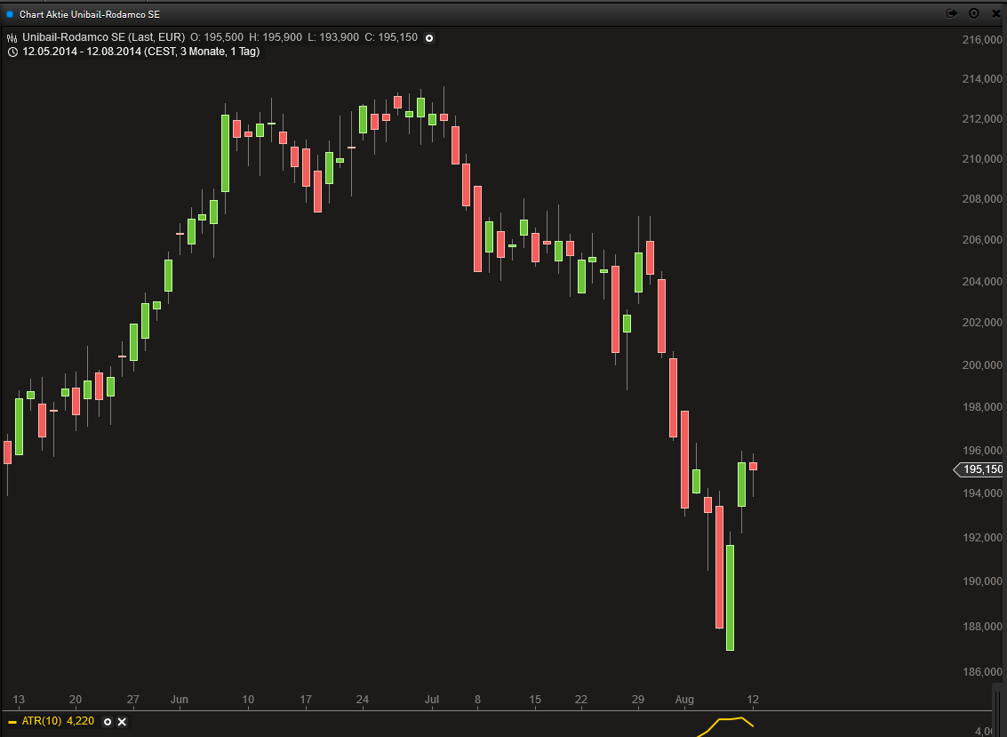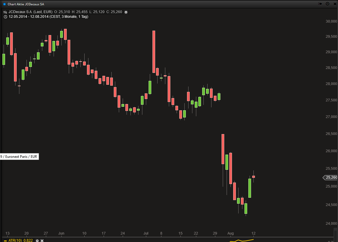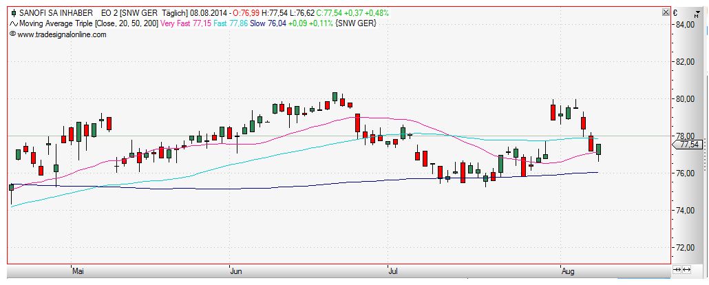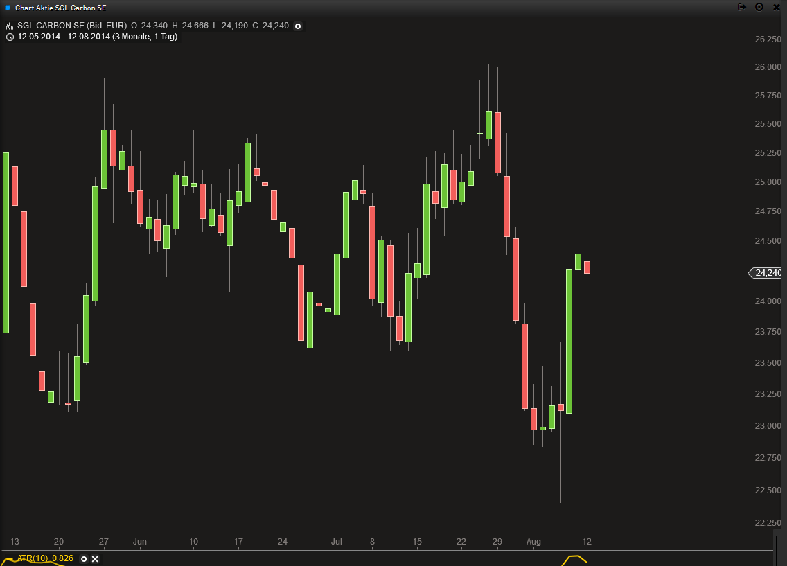 Nach einem mittelfristigen Abwärtstrend seit Mitte Februar 2014 wurde heute ein Aufwärtsgap gegen den Trend erzeugt. Zusätzlich ein kleiner Kerzenkörper mit bearishem Topping Tail.