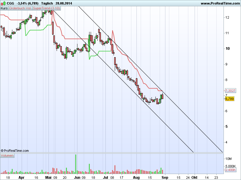 Sobald die gesamte (!) Kerze in die Gegenrichtung durchbrochen wurde (Tagesschlusskurs), steigt man zum Marktpreis am nächsten Morgen ein (die ersten Bewegungen kann man dabei abwarten). Nach zwei Tagen ziehst du dein Stop Loss / Buy nach, und zwar immer zwei Kerzen zurück. Du bleibst solange drin, bis dein "Zwei-Kerzen-Trailing-Stopp" durchbrochen worden ist. Carter steigt hier "manuell" aus, wartet also immer auf die Schlusskurse, ich habe mich entschlossen, zur Risikoabsicherung aber den Stop immer aktiv zu lassen.