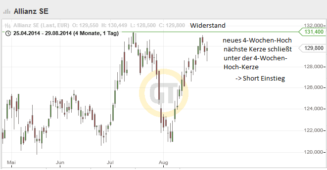 Du suchst 4-Wochen-Hochs für Shorts und 4-Wochen-Tiefs für Longs. Diese sollten sich allerdings knapp unter einem Widerstand bzw. Unterstützung befinden (wie Allianz heute). Die Hochs / Tiefs gibts über viele Inet-Seiten oder auch im WHS Techscan zu finden.