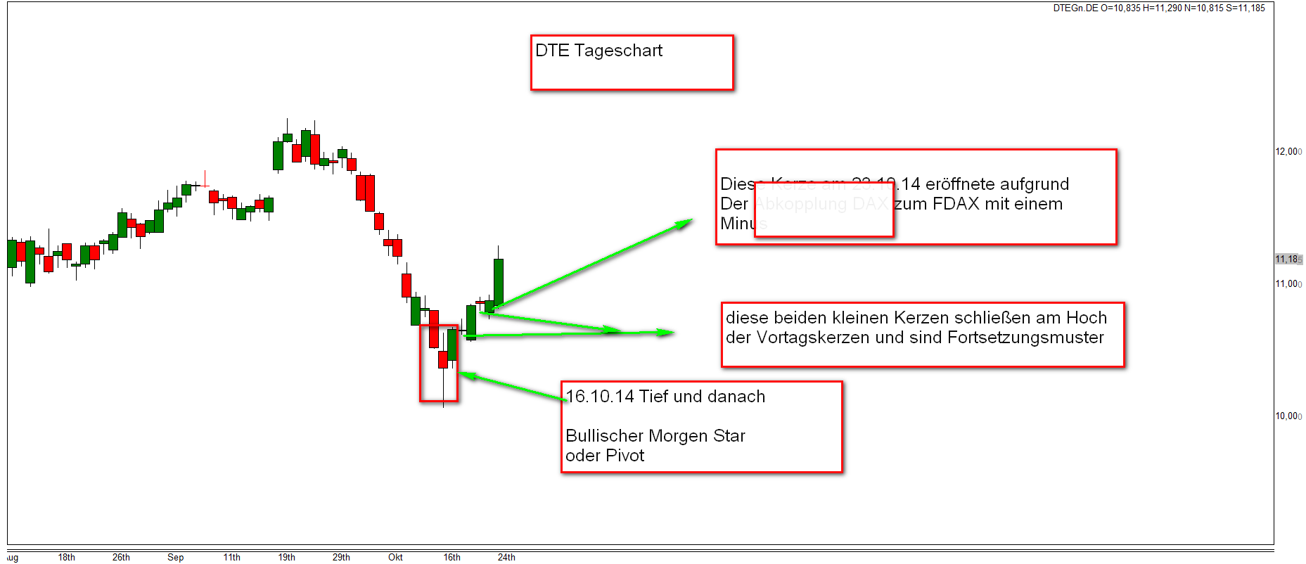 Am 16.10.14 habe ich in meinem Thread das vorläufige Tief für den DAX und den DOW dokumentiert. Betrachten wir dazu den eingefügten Chart der DTE so stellen wir am 16.10.14 und am 17.10.14 einen bullischen Morning Star fest. Warum in Folge die DTE immer als Shortkanditat gehandelt wurde bleibt mir ein Rätsel.