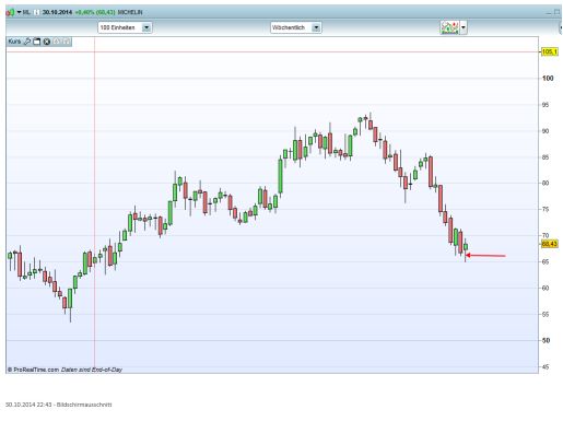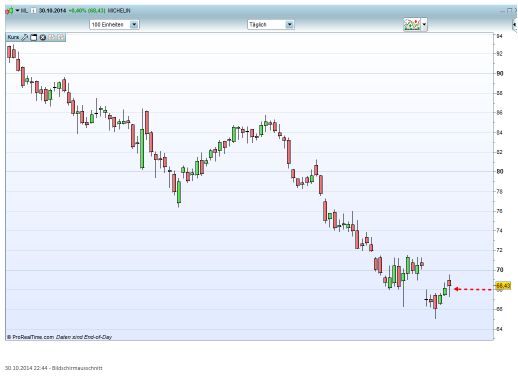 Ich würde Michelin nur shorten, wenn die bearishe Tageskerze einen langen Docht (=Short-Umkehrtstab) hätte. Sie hat aber eine lange Lunte (=Long-Umkehrstab). Siehe Grafik 1.