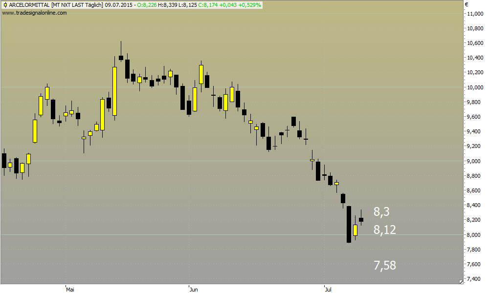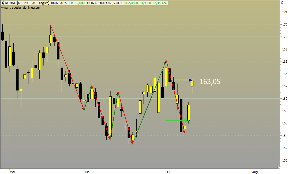 Große Kerze bei Air France: Einerseits wollen wir eine kleine Kerze, damit wir beim Einstieg nicht schon zu viel abgegeben haben und der ganze Weg noch vor uns liegt. Aber das Target liegt noch immer über dem letzten Swingtief. Damit ist für mich genug Platz. Die große rote Kerze signalisiert für mich, dass eine Umkehr stattfinden könnte, weil offensichtlich die Verkäufer sehr aktiv waren.