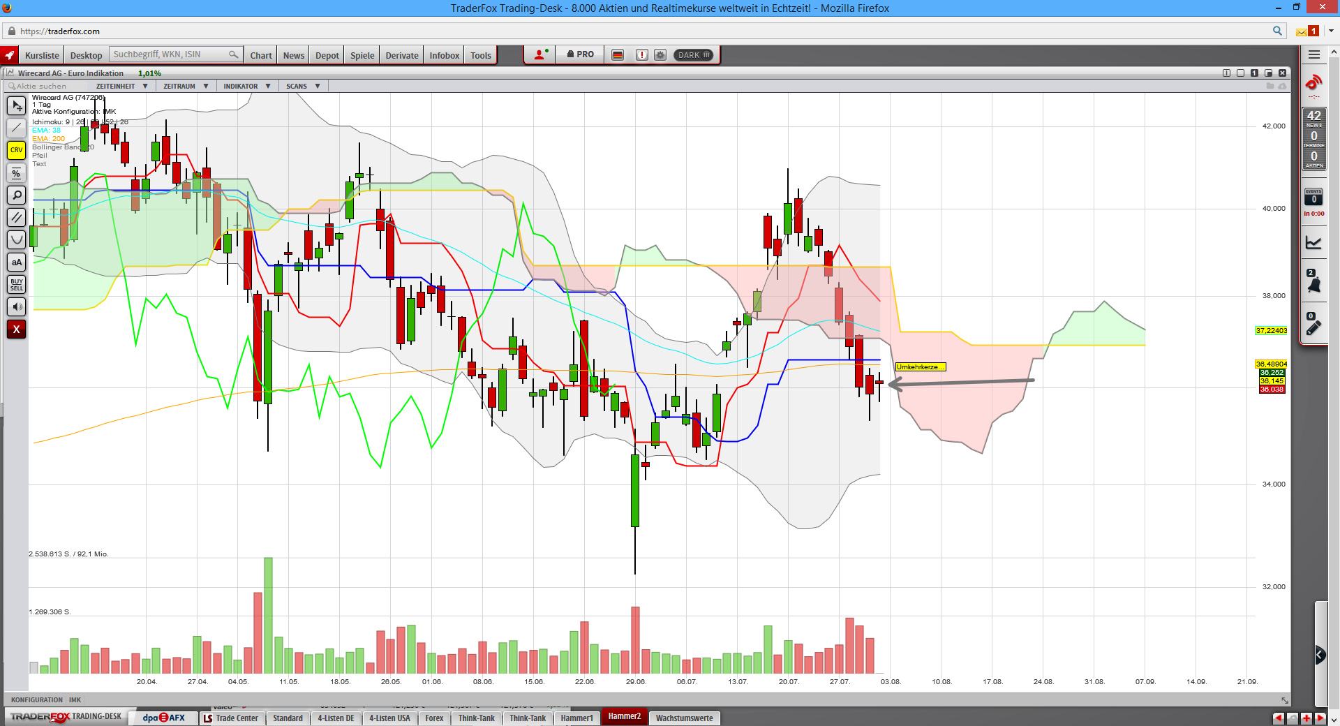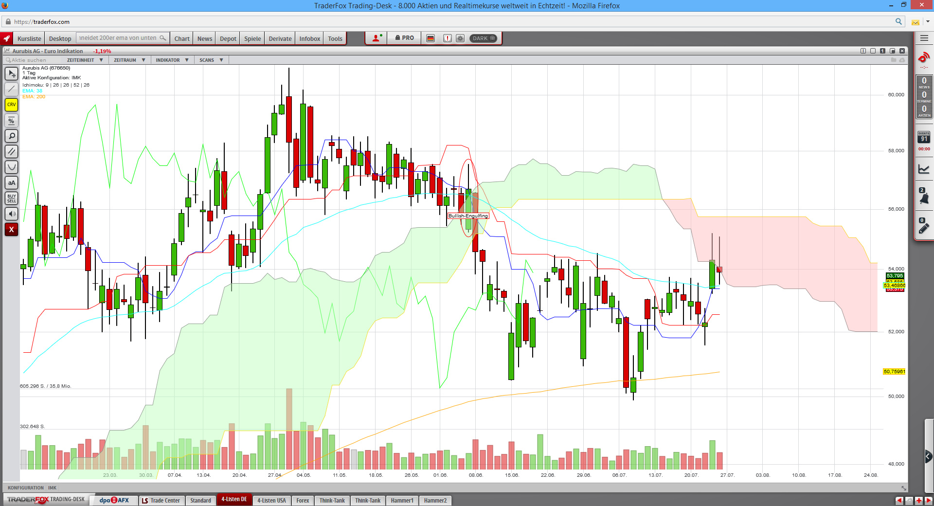 Die kleine bearische Signalkerze sitzt genau unter der Kumo als Widerstand. Der Kurs befindet sich seit Mitte Juni in einer Seitwärtsrange und hat es auch 23-8-15 nicht geschafft den oberen Rangebereich um die 54,45 €