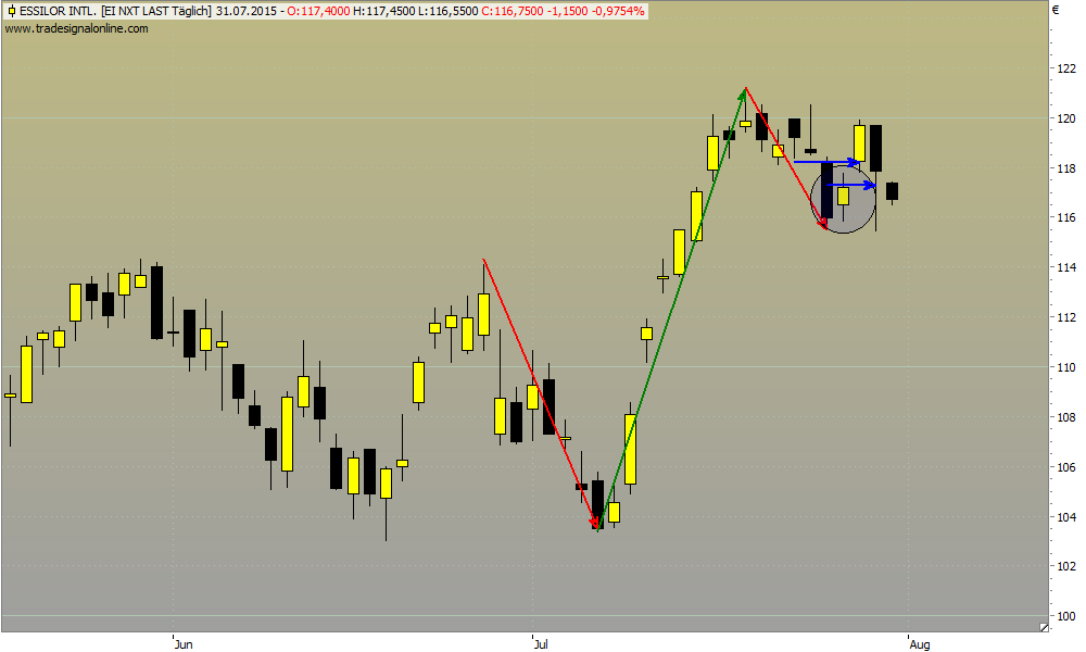 3. Renault: befand sich seit Mai in einer Seitwärtsphase, jeztzt Abwärtstrend, bestätigt durch Bruch des rel. Tiefs v. 09.07.15; 30.07., starker Abverkauf bis zur200er MA Unterstützung; Doji-starke Umkehrkerze; viel Luft nach oben.