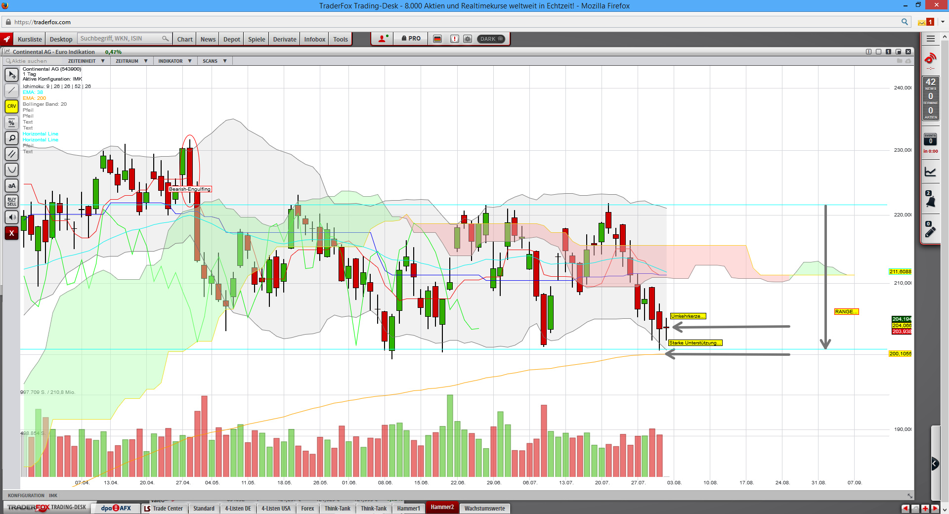 4. Conti: befindet sich seit Anfang Mai in einer Range (200,35 € bis 221,30 €); starke Unterstützung 200er MA; unterer Rangebereich; Umkehrkerze-Doji.