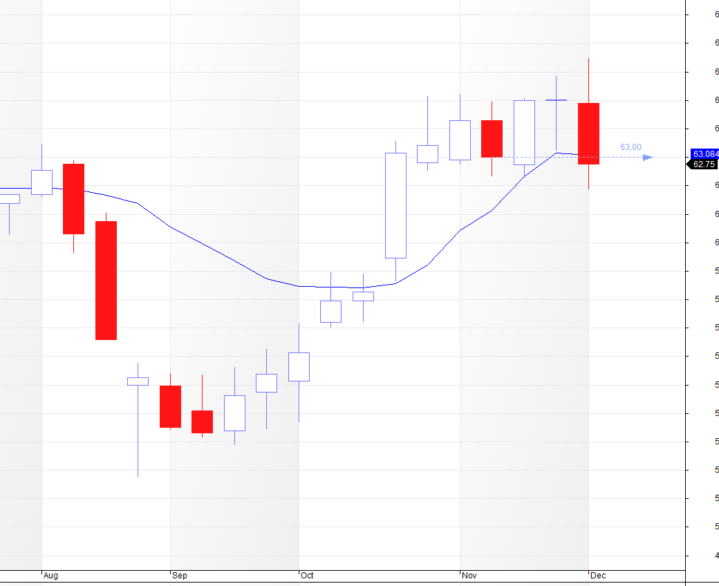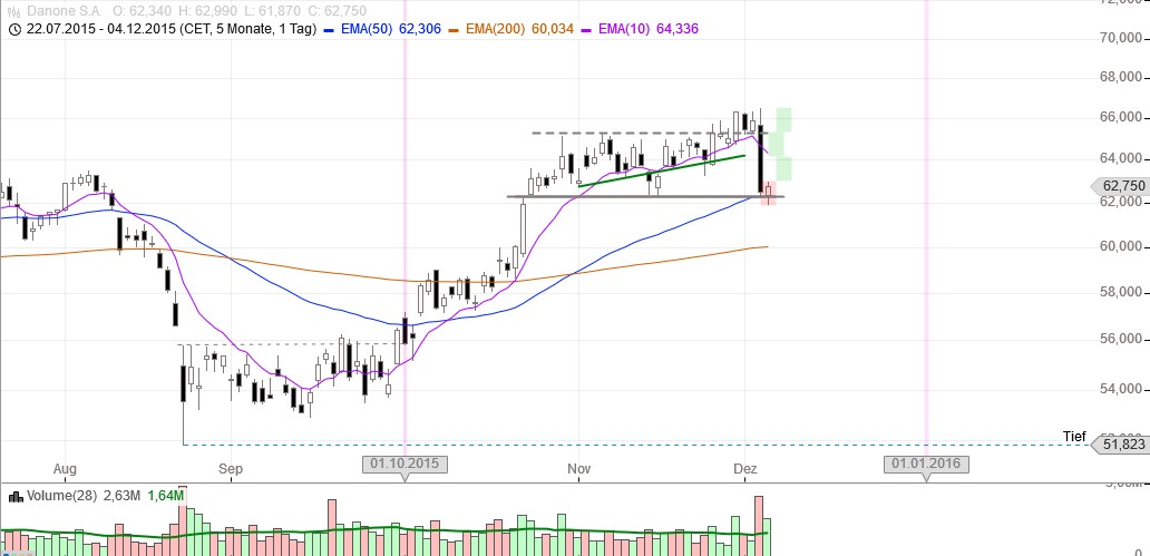 Bei mehreren Aktien war der Kurs, Tage vor dem EZB Entscheid , abgebröckelt. Nicht so bei Danone. Er ist relativ dynamisch aus der Range ausgebrochen, hatte seinen Pullback auf Ausbruchslinie und startete wieder mit einer weißen Kerze. Am 3.12 lief es ja auch in die richtige Richtung (Ausbruchstrading) bevor die EZB einen Strich durch die Rechnung machte.