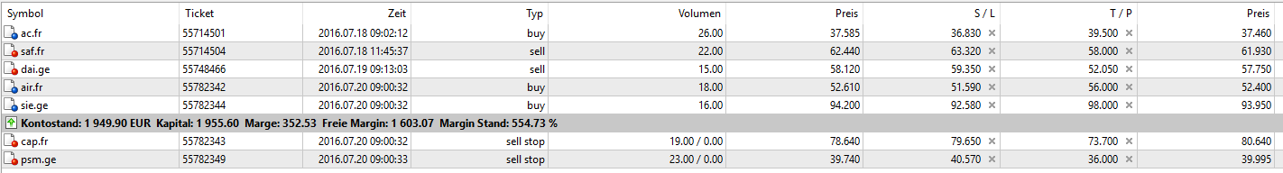 Der MT5 ist um 17:30 leider nicht gelaufen, jetzt hat es mir nicht automatisch die beiden Stop Sell Orders für Cap Gemini und ProSieben gecancelt, die beide nicht aktiviert wurden. Hol ich morgen Früh gleich nach, speziell Cap Gemini ist sowieso weit weit weg vom Auslösen.