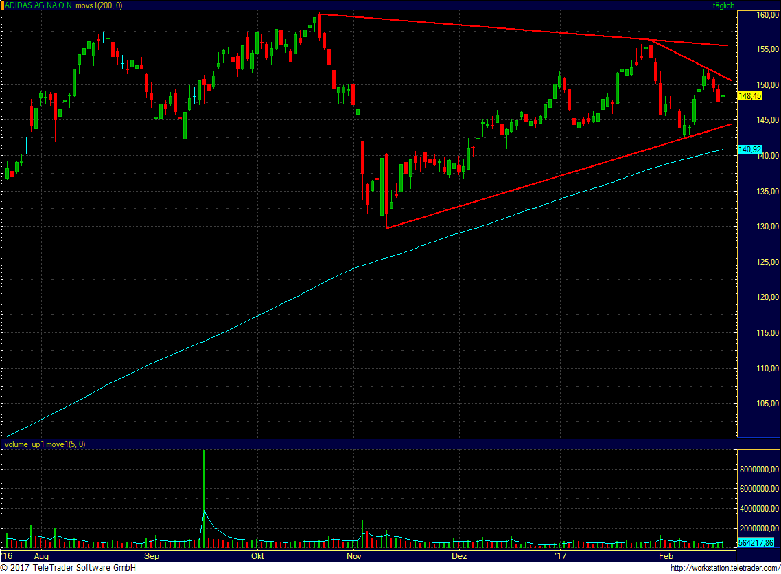 Mit Adidas habe ich das Problem, dass Schwungkraft verloren geht zuletzt, es drohen immer stärker Seitwärtsphase bzw. Konsolidierung im Keil.