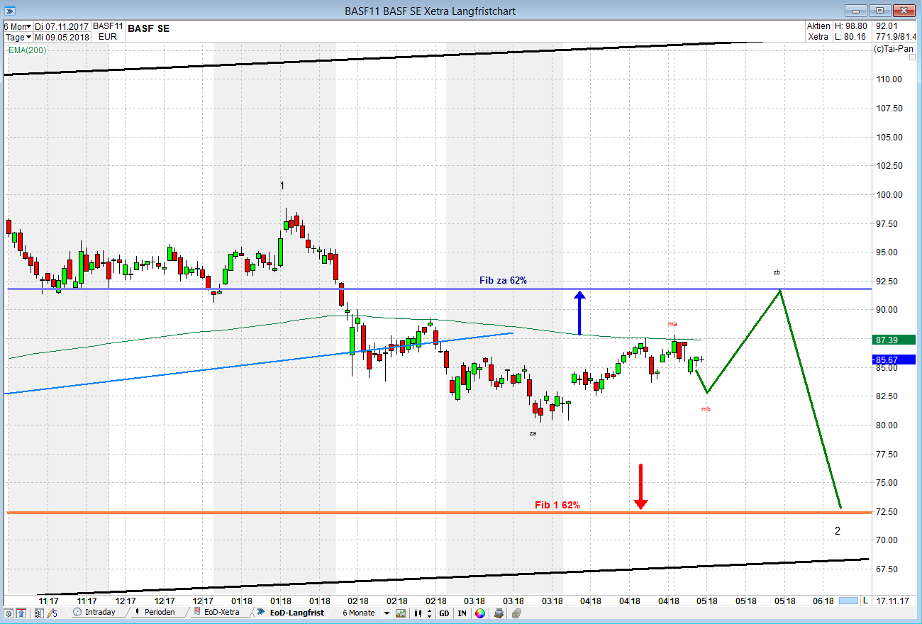 BASF vollzieht gerade die Korrektur des Aufwärtstrends seit Anfang 2016, der innerhalb des großen schwarzen Trendkanals läuft und mit „1“ bei 98,80 beendet worden ist.
