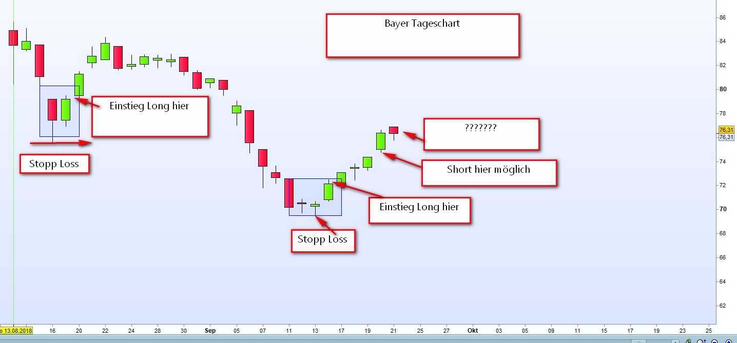 Eingefügt der Tageschart von Bayer. Die beiden eingezeichneten Long mit Stopp Loss unter Tief sind für mich nachvollziehbar. Ein Short, ausgehend von dem Schlusskurs Freitag ?