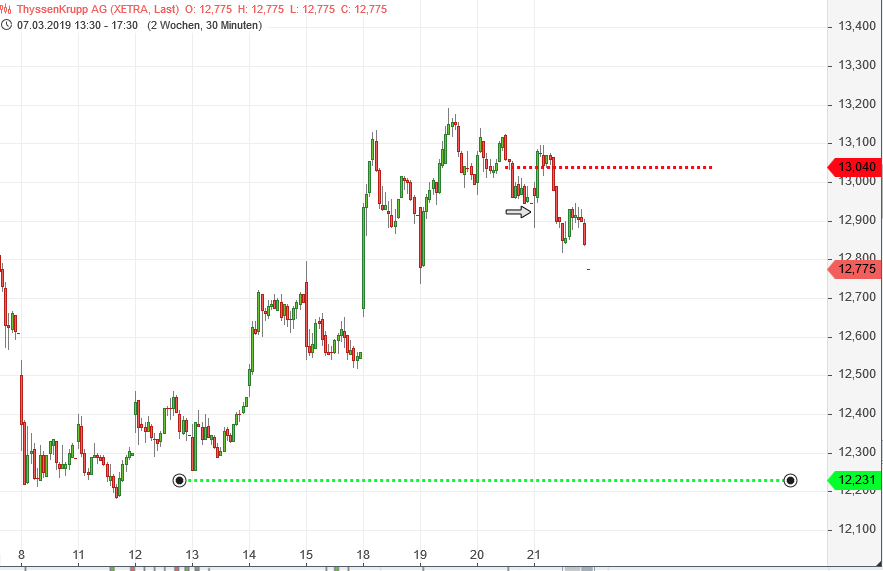 Der SL per ATR ist nicht mehr aktuell. Der SL wird im 30 min Chart nach Markttechnik (Swinghigh /-low) gesetzt. Ich habe die risikoreichere Variante mit dem SL 13,04 gewählt und bin entsprechend ausgestoppt worden. Man hätte den Stopp auch über dem Hoch bei 13,14 setzen können und wäre noch drin. Wenn die risikoreichere Variante läuft, ist man mit entsprechend größerer Stückzahl drin und das CRV steigt entsprechend. Muss jeder für sich entscheiden, welche Variante man wählt.