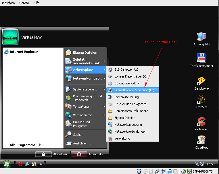 Aber wenn ich mir das recht überlege, wird das wohl nicht gehen, was du vorhast. Am besten du installierst WinXP innerhalb der VM neu. Solange dauert es ja nun auch wieder nicht. Oder ... arbeitest du mit irgenwelchen OS Image-Erstellungs Programmen? Dann wäre doch sicher die einfachste Möglichkeit, dass bereits fertige OS per Image rüber in die VB zu transferieren. Sorry, habe, es wie gesagt, falsch verstanden. Das, was du vorhast, habe ich selbst noch nicht versucht. Um vom Gast Os auf das Host OS zuzugreifen, gibt es einen Befehl im Windows Shell. Ich kenne diesen jetzt auch nicht mehr auswendig, aber ich schaue mal nach.