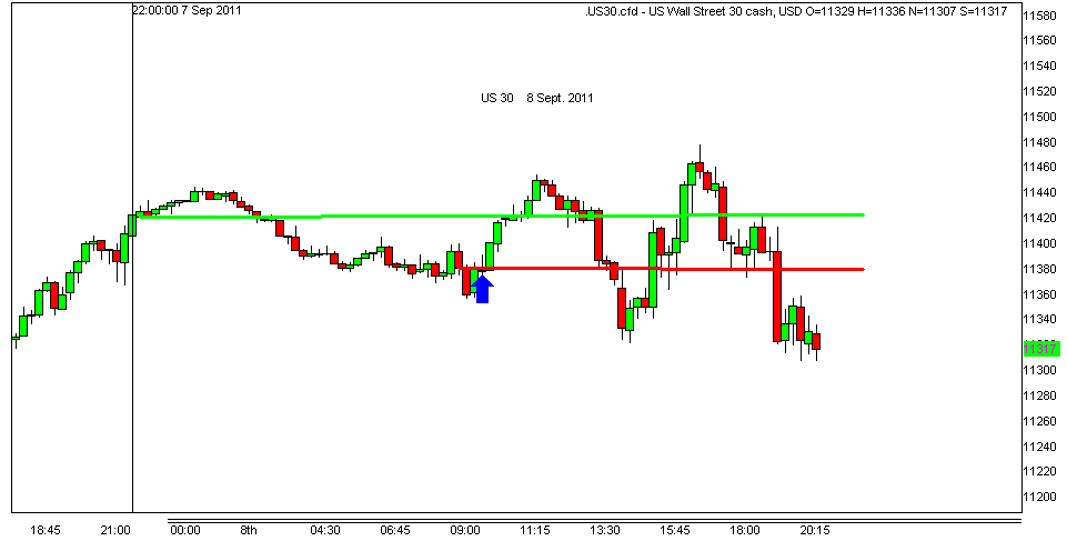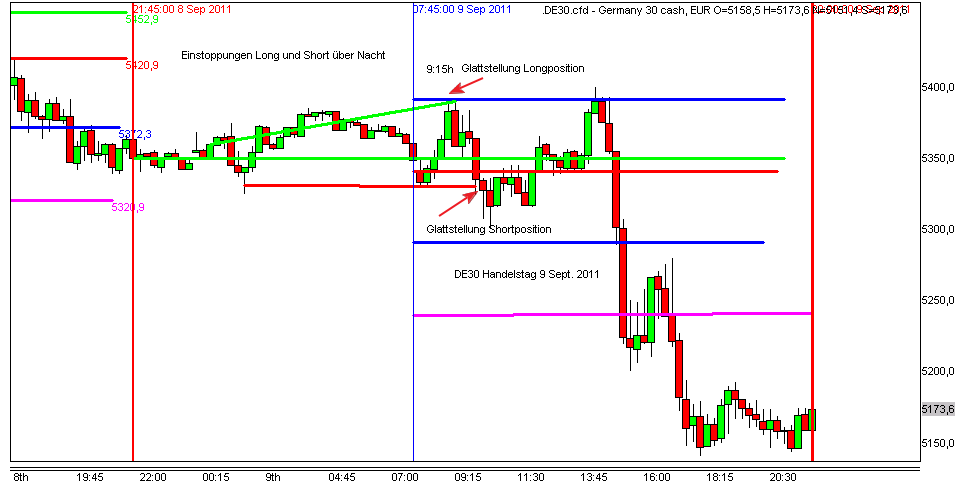 Eingefügt die Charts DE30 und US30 vom gestrigen Handelstag 9 Sept 2011. In Übereinstimmung mit dem Trademanagement der FDTS wäre bei Schliessung der Longposition an der ersten Aktionszone und Handel der
