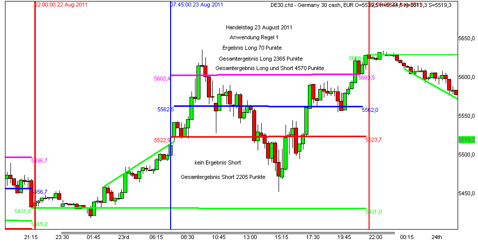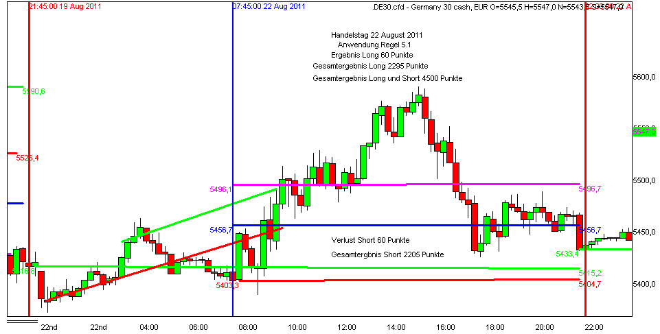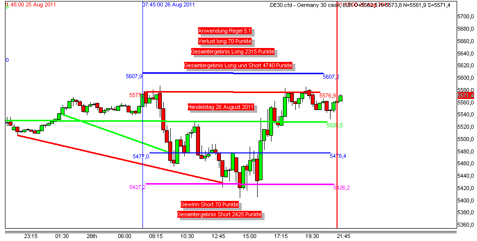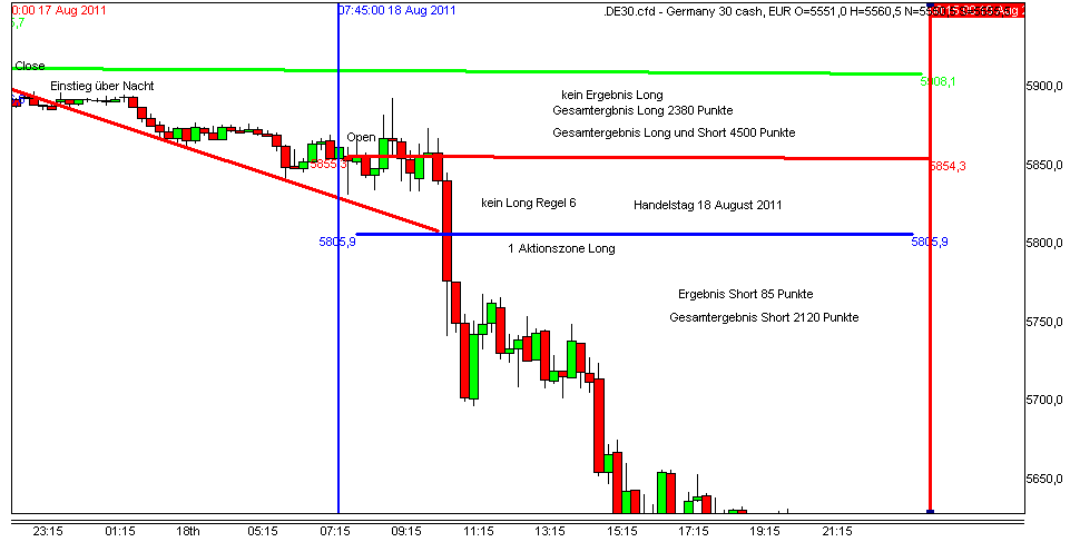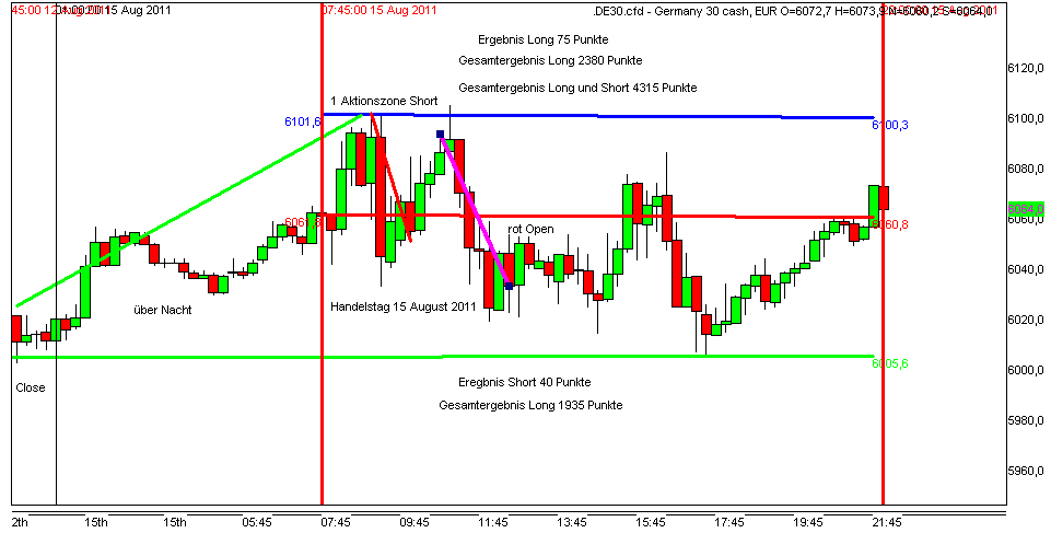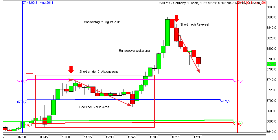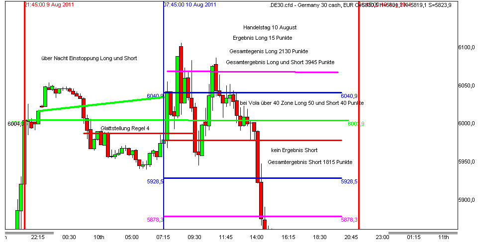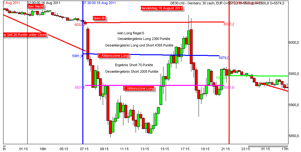 Der weitere Einstieg Short an der ersten Aktionszone , Magenta, wird für obigen Ansatz nicht gezählt , ist aber Bestandteil der Integrierten FDAX-TRADING-STRATEGIE .