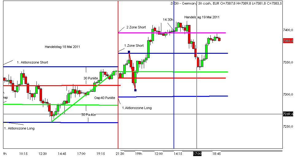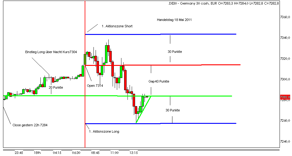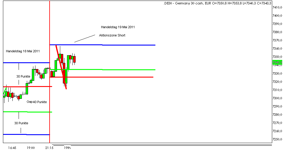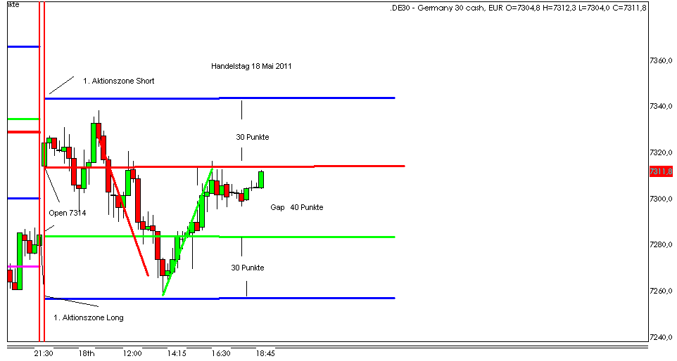 Für den 17.05.2011 bleibt festzuhalten, dass der FDAX wie gewünscht Punktgenau in der 1. Short Aktionszone sein Tageshoch hatte. -